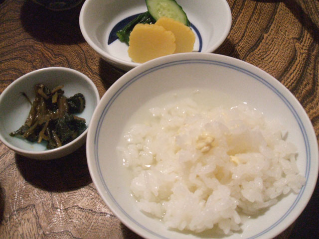 待っていたら、〆のご飯とおかわりどうぞのおひつとお新香が運ばれてきました。